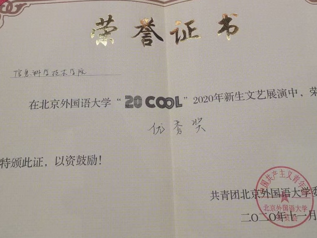 11月1日19:00,金年会jinnianhuicom“20 COOL”2020年新生文艺展演在千人礼堂举行。我院2020级新生准备的节目《忘了我 Remember me》在本次文艺展演中取得了“优秀奖”的成绩。