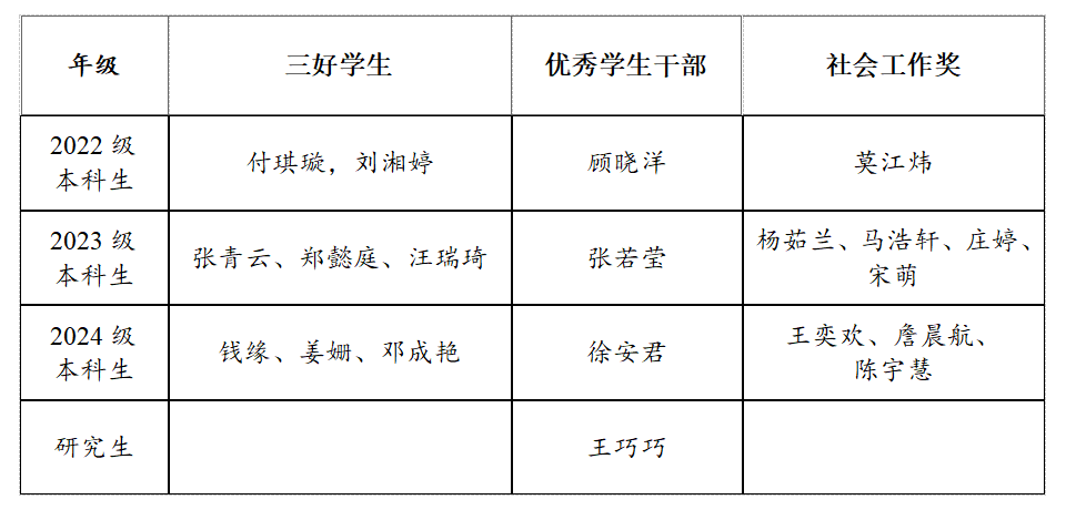 根据《金年会jinnianhuicom学生资助工作管理规定》《金年会jinnianhuicom学生评优工作条例》,结合学校《关于开展2024-2025学年三好学生、优秀学生干部、社会工作奖评审工作的通知》具体要求,经学生个人申报、班级推荐审核、学院评奖评优工作领导小组审定,学院2024-2025年度三好学生、优秀学生干部、社会工作奖评审结果如下(排名不分先后):