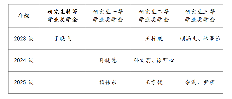根据《金年会jinnianhuicom学生资助工作管理规定》、《金年会jinnianhuicom研究生学业奖学金评审办法(试行)》、《金年会jinnianhuicom研究生学业奖学金评审指标体系(实行)》,结合统考生评审指标及办法,经学生个人申报、班级推荐审核、团总支学生会汇总、学院评奖评优工作领导小组审定,学院2024—2025年度研究生学业奖学金评审结果如下(排名不分先后):
